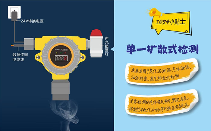 擴散在線式氣體探測器能夠實時的檢查空氣中是否含有一種或多種可燃及有毒有害氣體,一般使用于開放場合,如敞開的作業車間,檢測空氣中泄露的氣體。這種方法受檢測環境的影響,如環境溫濕度、風速風向等,監測數據會存在一定的誤差。